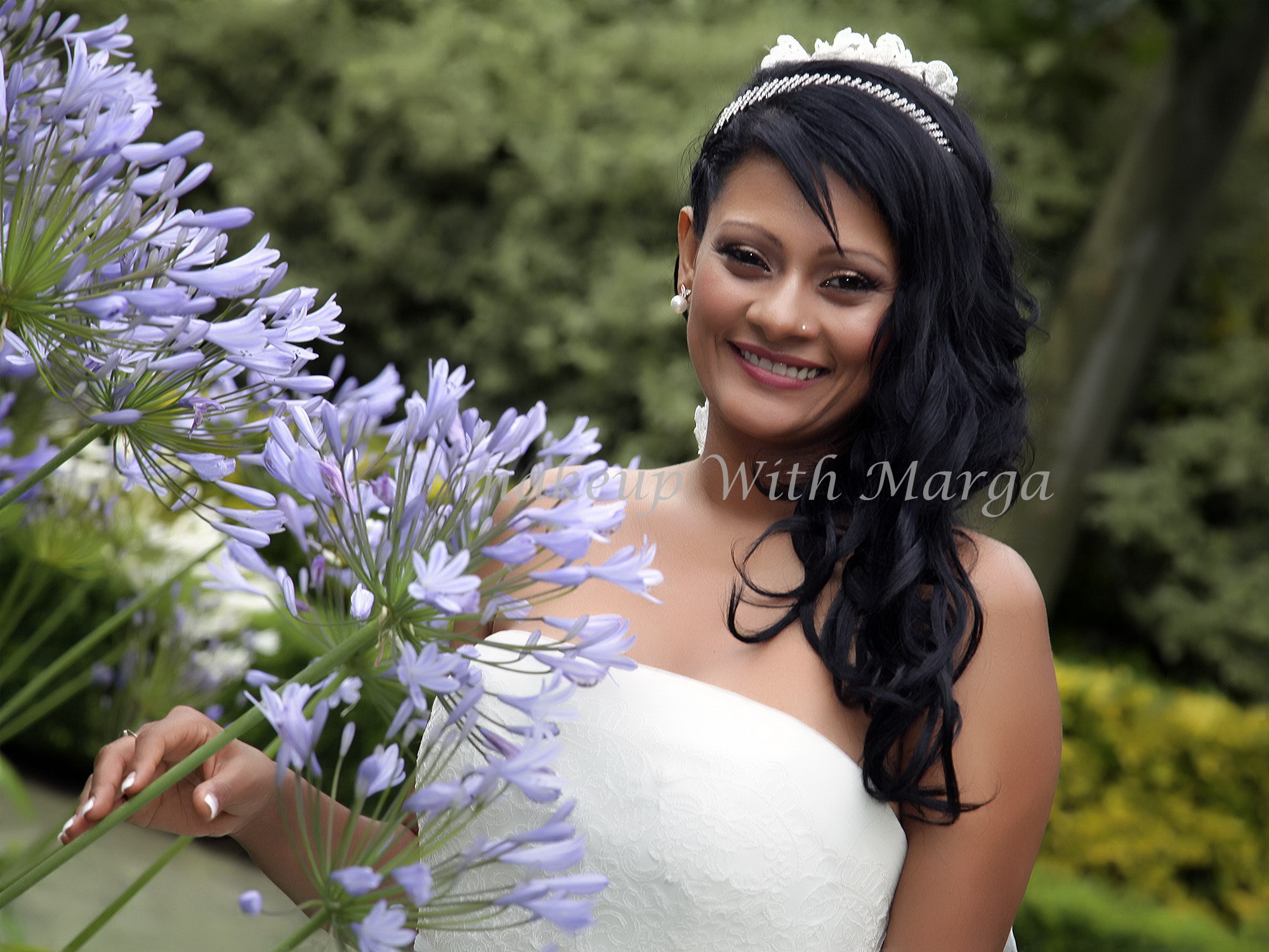 Isabel tenía muy claro lo que quería para ese día, la melena hacia un lado y cayéndole sobre un hombro. Tiene una media melena, así que le puse unas extensiones de quita y pon a las que previamente teñí y ondulé. Le sugerí una trenza lateral como la de Shaila y el resto del cabello alise y a la vez ondule (porque lo tiene muy muy rizado), acabamos con una tiara maravillosa, colocada extratégicamente.