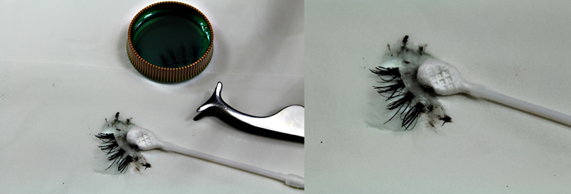 Metí las pestañas postizas en el botecito y las cubrí de desmaquillador, las dejé una noche entera y al día siguiente las saqué con las pinzas. Con los bastoncitos y con suavidad fui retirando todo el pegamento y suciedad de las pestañas, hasta dejarlas como nuevas. Un ratito para que se secaran y tatachan pestañas como recién compradas.