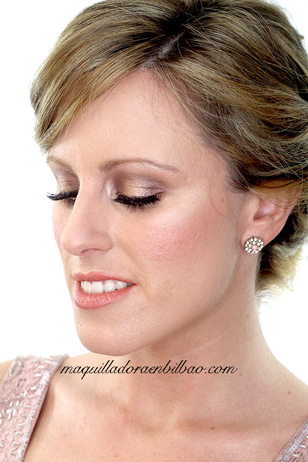 Patricia tenía claro que le apetecía llevar en los ojos, un smoky o ahumado, utilicé la paleta de Too Faced Chocolate Bar que tiene unos colores preciosos y en el centro del ojo le puse un dorado bien integrado con los otro tonos. Ella tiene unos ojos grandes que aún resaltaban más con el ahumado.