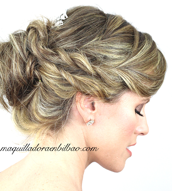 Patricia iba de invitada a una boda a la cual iba a llevar un maravilloso vestido  muy años 20, vestido en el que las fotos no le hacen justicia por lo bonito que es, tiene un generoso escote en la espalda por lo cúal le aconsejé a Patricia un recogido para dar importancia a ese escote tan bonito. A ella la idea le encantó pero quería algo desenfado y que no le echara años encima 😉 le enseñe varios y eligió este que a mi también me parecía estupendo.
